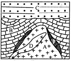 5、单选题 下图是某地地质剖面图,根据岩石的相互关系,图中A、B、C、D、E岩石形成的先后顺序(从新到老)为