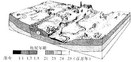 A.河流形成与距今2300万年前? B.①处经历了先侵蚀后沉积过程