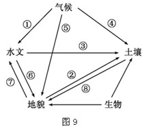 【小题2】黄土高原地貌特征形成受到气候⑤、水文⑥、土壤⑧的影响,不能表示的是⑦。