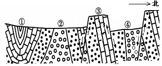 (1)图中①②③④四处,在地质构造上属于背斜的是 ,属于向斜的是 ,属于地垒的是 ,属于地堑的是 。在野外考察中,有时会见到一些在向斜构造上发育的山地,其原因是 。