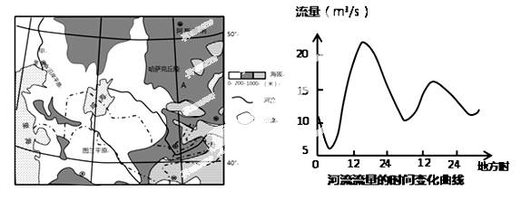 5、综合题 (10分)读世界某区域地形图(左图)和甲地河流流量的时间变化曲线图(右图),完成下列各题。