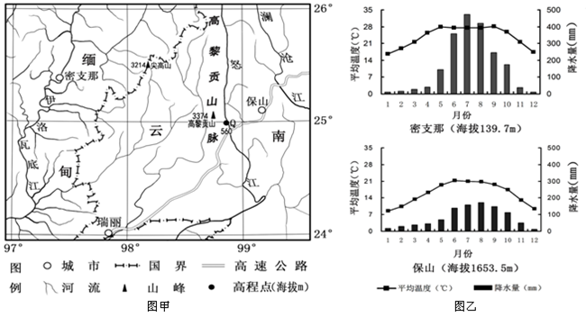 2、单选题 高黎贡山脉两侧自然景观差异显著。图甲为高黎贡山脉南段两侧部分区域略图,本区域山地冰川的雪线海拔高度在4 800 m左右,图乙为图甲中密支那和保山的气候统计图。读图,完成下列小题。