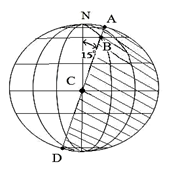 3、综合题 读右图“太阳光照图”(图中阴影部分为夜半球,非阴影部分为昼半球),图示时刻北京时间为7月某日11时20分。读图回答下列问题:(9分)