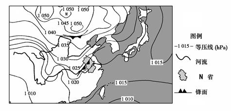 【小题2】从图中可知,大陆为高压,海洋为低压,故该季节为冬季。未来两天,N省受冷锋影响,且冷锋不断南移;N省北部地区位于冷锋锋后,即冷锋已经过境;冷锋过境后,天气晴朗,农作物易受低温冻害影响。