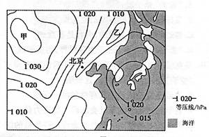 小题2:读图可知,北京位于低压槽内,易形成冷锋,此处等压线密集,风力较大,冷锋势力强,那么暖空气水汽含量大,在快速抬升的过程中,水汽凝结,形成暴雪。故选D。