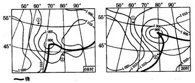 4、单选题 下图是某日08时和20时海平面气压分布图(单位:百帕)。读图,回答问题。