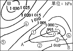 A.甲地周围气流呈逆时针方向,不对。甲为北半球的反气旋,气流呈顺时针方向流动。