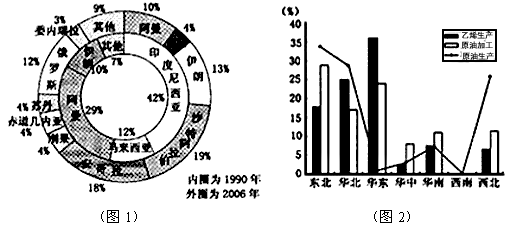 5、综合题 ? 图1为1990年和2006年我国原油进口来源地结构图,图2为2006年各地原油生产、原油加工和乙烯生产产量占全国的比重。读图回答问题。