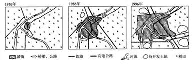 本题解析:本题考查城市化过程。(1)图示反映城市用地规模不断扩大,故属于城市化过程。城市化的特征表现在城市人口增加;城市人口比重上升;城市用地规模不断扩大。(2)城市由于人口和工业过于集中、建筑物高大稠密,故产生严重的“工业三废”、噪音和光污染等。(3)城市规模的扩大,占用大量农业用地;且城市环境污染严重,城市化过程中会使环境污染向郊区扩展。(4)城市规模扩大,对农产品的需求量上升,故郊区适宜发展乳、肉、蛋、禽、蔬菜、园艺等郊区农业。