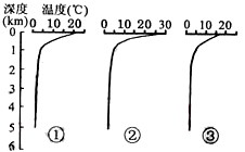 1、图中表示海洋表层温度、盐度、密度的曲线依次是