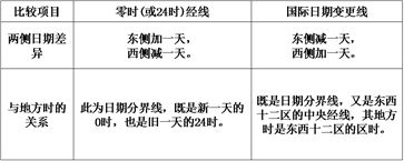 1.本题考查国际日期变更线的问题。日期变更线分为国际日期变更线和自然日期变更线。飞机在飞越太平洋中部时跨过国际日期变更线,从广州飞往美国是从国际日期变更线的西侧进入东侧,日期推后一天,即调慢 24 小时。日期变更线有国际日期变更线和自然日变更线之分。列表比较如下:
