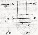 小题2:根据三地的经度,甲乙位于175°E,丙位于175°W,甲乙位于同一经线上,故甲位于乙的正北方向。