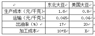 (3)根据材料二表格比较,可以看到东北大豆出油率低,价格高,加工成本高。使用美国的大豆成本低,出油率高,利润高。