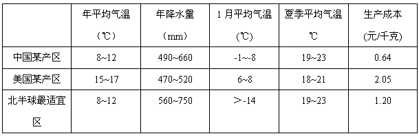 3、单选题 下表是中美两国的两个苹果产区与北半球苹果生长最适宜区的气候条件和生产成本的相关资料。据表回答1—2题。