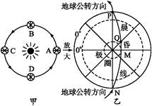 (1)如果地球处于A位置时为12月22日,指出乙图中表示晨线和昏线线段的字母,并补画箭头表示地球的自转方向。