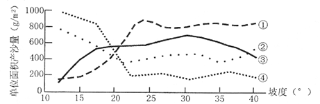 小题3:水土流失一般的分布规律为:坡度小的地方,受雨面积大,径流量大,但流速小,侵蚀程度较小;随坡度增大,侵蚀强烈,水土流失严重;当坡度大于40°-50°,受雨面积小,虽然流速大,但径流量小,侵蚀程度较小。所以图中坡度小于20°时,单位面积产沙量应该较小,当坡度大于20°时,单位面积产沙量增大迅速,当坡度未达到40°之前维持在一个较高的水平。所以选A项。