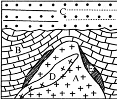 1、单选题 图是某地地质剖面图,根据岩石的相互关系,图中A、B、C、D、E岩石形成的先后顺序(从新到老) 为
