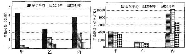 小题2:与乙、丙两站相比,甲水文站2010年、2011年的年输沙量和多年平均输沙量差异很大,其原因最可能是
