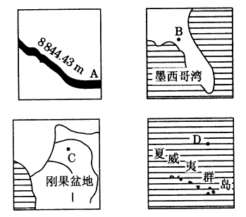5、单选题 为了探测莫霍面的情况,在下图中的A、B、C、D四点同时进行了地震波的测定,其中最迟得到从莫霍面传来的地震波的地点是