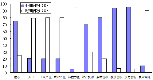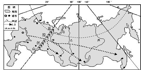 ![]() (1)据材料一,说出俄罗斯东西向的主要交通方式?并分析主要原因有哪些?(3分) (2)据材料二,分析甲乙丙三河流径流季节变化特征及影响因素。(3分) (3)据材料三,评价俄罗斯亚洲部分发展经济的优势条件。(2分) (4)简述俄罗斯人口迁移对流入地的主要意义。(3分) 参考答案:(1)铁路(运输)(1分);①东西距离远(或国土面积大)(1分);②资源地与消费市场距离远,货运量大(1分);③冰封期长,水运不发达(1分)(任答两项得2分)。 本题解析:(1)结合图示,俄罗斯的河流主要呈南北流向,故东西向的交通主要依靠铁路运动。其原因主要从河流分布、运输距离和资源分布状况等因素分析。(2)直接根据表格信息判断河流径流量的季节变化特征即可。主要从其河流径流量的主要补给水源—季节性积雪融水分析即可。(3)根据材料三的信息分析,其亚洲部分的面积、矿产资源、森林资源、水资源和水能资源等方面具有明显优势。(4)根据图示的人口迁移方向判断,俄罗斯人口主要由欧洲部分向亚洲部分迁移,而结合俄罗斯的资源、经济发展状况等可判断,其亚洲部分人口密度较低,但资源丰富,国土面积辽阔,人口迁入可提供大量劳动力,促进其资源的开发,促进经济的发展等影响。 本题难度:一般 | |||||||||||||||||||||||||