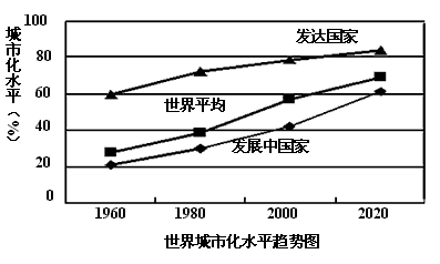 1、单选题 社会经济的发展推动着城市化进程,“世界城市化水平趋势图”表明21世纪
