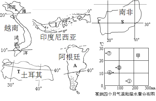 (2)图甲代表的气候类型是??, V、I、S、T、A五国中的(填字母)国家分布有该气候类型(4分)