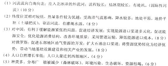 (1)相对于伏尔加河,概述鄂毕河的河流特征。(10分) 伏尔加河——顿河流域是俄罗斯的主要农业区。 (2)分析该区域成为俄罗斯主要农业区的优势自然条件。(8分) 2010年9月,全长1000公里的中俄原油管道(东西伯利亚——太平洋石油管道中国支线)工程全线竣工,12月19日正式进油投产,标志着中俄能源合作进入新阶段。 (3)在中国、俄罗斯两国中,任选其一,说明上述合作对该国的积极影响。(8分) (4)简述俄罗斯东部地区人口急剧减少的原因。(4分) (5)概括俄罗斯矿产资源优势,并指出在开发利用中易出现的问题。(6分)