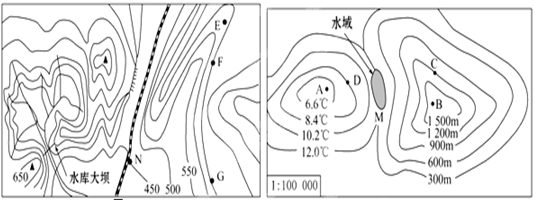 【小题3】右图中根据等温线分析,A地气温比四周低应是山地,A、B、D三处的水可汇入图中水域,但C处与图中水域之间隔了一道山岭,C处水不能汇入图中水域;F、G的海拔是650米,E在600~650米;在E N之间有一道凸起的山脊,在E点观察不到车站N;铁路途经山区,图中沿线坡度很陡,附近还有陡崖,所以沿线要注意预防滑坡和泥石流。故选D。