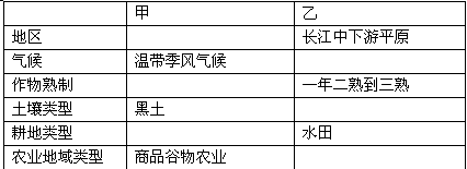 (1)据图分析,甲图为我国的东北地区,乙图为我国的长江中下游平原地区。所以甲地气候类型是温带季风气候,土壤是典型的黑土,农业地域类型为商品谷物农业。乙地作物熟制为一年两熟到三熟,耕地类型为水田。