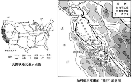 3、综合题 (10分)读美国铁路交通示意图和加利福尼亚州的“硅谷”示意图,回答下列问题。