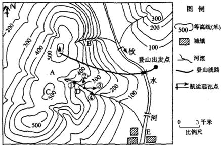 (1)图中登山线路出发点与山顶之间最大温差不超过____________℃。该登山线路总长度约为_____(选择填空)。 A.10千米?B.16千米? C.30千米? D.38千米 (2)该地区山林茂密,山麓代表性植被是_________,同学们沿登山线路行走,观察到沿途植被垂直变化不大,主要原因是____________________________ (3)图中B、D两条河流,水流较湍急的是_____河。图中较为缺乏适合修建水库的地点,请简析原因_______________________ (4)图中航运起讫点_________(以南或以北)河段因航运条件差,不适于行船。 (5)同学们把夜晚宿营地点选在图中A处,试从地形方面简述理由。______________________ (6)如果人在D处突遇泥石流,①②③④四条逃生路线中最佳的是_________。
