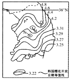 4、单选题 韩国的樱花每年从3月下旬开始绽放,直到5月中旬结束,花期长约1个半月,期间都会有大量中国游客赴韩赏花。下图为“韩国樱花开放日期等值线图”,据此回答下列各题。