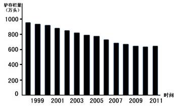 下图为“1998~2011年我国驴存栏量柱状图”。