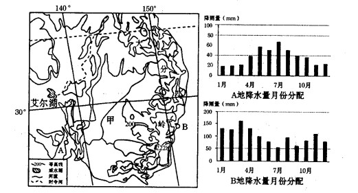 (1)对比A、B两地的降水量月份分配图,可知A、B两地降水量有明显的季节变化,但A地降水总量少于B地,A地冬季多雨,B地夏季多雨。