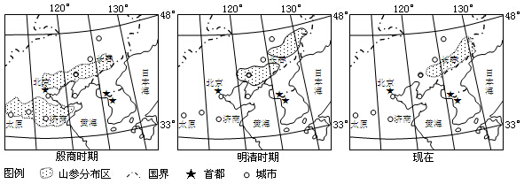 成因:因气候变迁,华北山参生长环境退化,而东北山参生长条件更适宜;(2分)殷商以后,华北开发较早,(森林)植被破坏严重,而东北开发较晚,植被茂密;(2分)华北人口激增,过度采挖山参,而东北在清朝政府禁令影响下,山参保护较好。(2分)