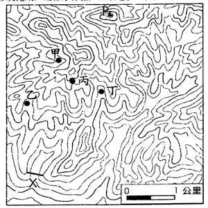 4、单选题 下图是某地等高线地形图,图中甲、乙、丙、丁为养猪户所在,X线段是预计要修筑水坝的位置。若水坝修筑完成,则哪家养猪户必须迁移,以免污染水库水源