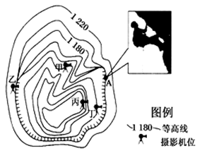 【小题2】在陡崖底部,由下向上拍摄即可,图中丁位置较合适。甲、乙与A处之间有脊线阻挡视线而不合适;丙位于天坑底部,且丙右侧为一“凸坡”而不能全程拍摄A处绳降过程。