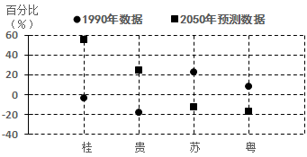 ①提高城市化水平?②改善环境质量?③促进产业结构调整?④增加交通压力 A.①②③ B.②③④ C.①②④ D.①③④ 参考答案:小题1:C 本题解析:本题考查我国的人口迁移和读图分析能力。 本题难度:一般 2、单选题 下图表示“我国某省2009年各类人口数量构成图”。关于该省人口的叙述,正确的是(?) 参考答案:D 本题解析:由“我国某省2009年 各类人口数量构成图”可知:15岁到64岁人口多,劳动力充足,0到14岁人口少,自然出生率没有过高,总人口减去农村人口等于城镇人口,可以得出城镇人口不超过一半,65岁以上人口达到了10%,因此该省老龄化现象严重,答案选D。 本题难度:简单 3、单选题 下列国家人口增长模式属于现代人口增长模式的是 参考答案:D 本题解析::本题考查人口增长。目前处于现代型人口增长模式的主要是发达国家(如日本)和发展中国家中的韩国、古巴、中国等。 本题难度:一般 4、单选题 读“桂、贵、苏、粤四省区老年人口比重与同期全国老年人口比重平均水平差值百分比图”据此完成下列各题。 |