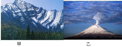 【小题1】图中甲为褶皱山地,乙为火山。形成甲的原因是受地壳运动的影响;形成乙的原因是由岩浆活动引起的。答案选A。