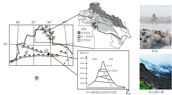 目前新疆的许多地方仍然存在着大规模、远距离的游牧(季节性转场)现象,即随着季节的变换,牧民们在盆地和山地间的不同海拔高度上,相应地变换着牧场。(如图甲)