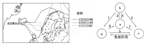 4、单选题 2010年4月14日,冰岛埃亚菲亚德拉冰盖下的一座火山喷发,火山灰弥漫天空,严重影响欧洲的航空业。图7是冰岛火山灰主要扩散区域分布示意图。回答题。