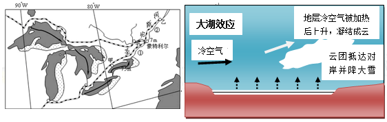 【小题1】认真阅读图中信息,准确理解“大湖效应”。冬季湖水水温比南下的冷空气气温高,南下的冷空气经过湖面时升温并携带水汽上升,到高空后遇冷水汽凝结形成降水。因此大湖效应与冷空气活动有关,湖面不结冰是发生大湖效应的心要条件。故D正确。