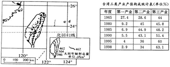 4、综合题 读台湾太阳年辐射总量分布图和台湾三类产业产值构成统计表,回答下列问题。(14分)