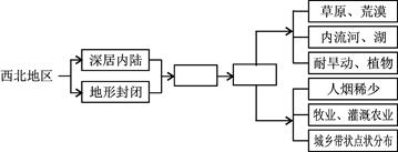 我国西北地区深居内陆,并有山岭阻隔,海洋水汽难以进入,年平均降水量由东部的400毫米左右往西减少到200、50毫米以下。长期的干旱,使这里形成的独特的自然景观。其要素如图所示: