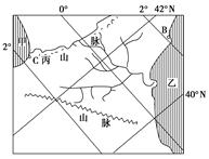 小题1:由图可知该地区为伊比利亚半岛。乙处海域为地中海。丙处为比利牛斯山,该山为西北-东南走向。甲海域为比斯开湾。夏季时西风从海洋上吹来暖湿气流,C处处于迎风坡降水比B处多。