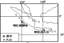 3、单选题 北京时间2010年10月25日22时42分,印度尼西亚苏门答腊省明打威群岛附近海域发生里氏7.2级地震,并引发海啸。10月26日晚8时左右,位于爪哇岛上的默拉皮火山开始喷发并且天空下起了“石头雨”。结合图完成下题。