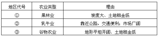 (3)该城市周边地区因地制宜发展了乳牛业、果林业和谷物农业。请将①、②、③地适宜发展的农业类型及其理由填入下表相应的空格内。