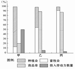 本题解析: 小题1:甲种植业比重大,需大量劳动力,但商品率低,为季风水田农业;乙种植业、畜牧业比重相当,商品率高,劳动力少,机械化水平高,为混合农业;丙畜牧业为主,商品率高,机械化水平高,为大牧场放牧业,答案选B项。 小题2:甲为季风水田农业,主要优势条件地形平坦,土壤肥沃,雨热同期,劳动力充足,种植历史悠久,经验丰富,符合条件的只有B项。