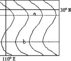 1.图中正确表示河谷发育位置的是 A.110°E线? B.30°N? C.a线? D.b线 2.图中分水岭两侧(不考虑其它因素)太阳能最丰富的是 A.a线北坡? B.30°N线北坡? C.b线北坡? D.b线南坡