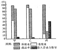 本题解析:1.甲地区种植业和畜牧业并重,为澳大利亚的混合农业;乙地畜牧业比重高,商品率高,为乳畜业;丙种植业比重高,劳动力投入多,商品率低,为水稻种植业。所以本题选择B选项。